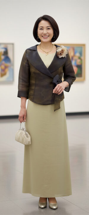| 商品説明 | 上品な大人の女性におすすめのママドレスコーデ。色白の方にはグレーの組み合わせがよくお似合いです。若々しさを演出したい場合には、シルバーのフレンチカットドレス(DR-02)とのコーディネートもおすすめです。 |